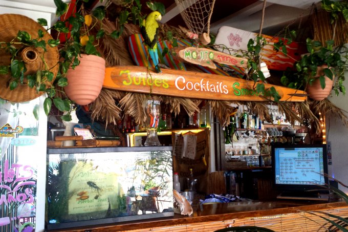 Relaxing, tropical sounding rhythms drifted out onto the sundrenched beach and colourful Tibetan-style prayer flags flapped merrily in the cool sea breeze. I noted that there was ramp access to the terrace providing ease of access to disabled guests. Most importantly, the beautiful young lady behind this Ibiza bar was wearing that most charming of accessories, a large smile. Ahh. Better!