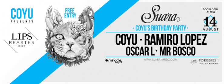 Suara's house and techno party has wrapped up its season with Sankeys this year and record label boss, Coyu, is inviting you lot to make your way down to Playa en Bossa to celebrate his 30th birthday. The kitty kingdom visionary is taking over the fresh aired Lips beach bar restaurant tonight until midnight and entry is free, so no excuses not to get down and gatecrash his party to make sure his entry into his third decade of life is a big one.