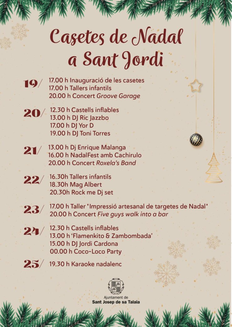 On the square next to the white church of Sant Jordi a small Christmas market with some wooden huts (casetes de Nadal) brings a festive atmosphere to this village near Playa d'en Bossa.