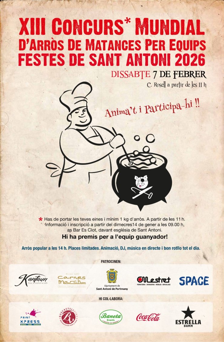 The World Championship of Arròs de matances, a traditional Ibizan rice dish with meat, cooked in a paella pan, forms part of the San Antonio patron saint festivities and will be held on Saturday, 7 February on Rosell Street. The cooking competition kicks off at 11:30, and the delicious rice dish will be served at 14:00, accompanied by music and a great atmosphere.