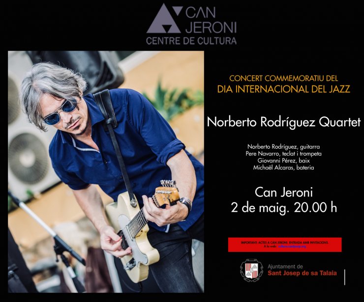 On May 2 at 20:00 h we celebrate the International Jazz Day in Can Jeroni cultural centre in San José with a concert by the Norberto Rodríguez Quartet, made up of Norberto Rodríguez on guitar, Pere Navarro on keyboard and trumpet, Giovanni Pérez on bass and Michaël Alcaras on drums.
