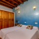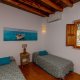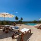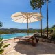 The villa comfortably accommodates families or small groups in three air-conditioned double bedrooms. The primary suite offers direct terrace access and a double bed, while the two additional bedrooms offer flexible configurations with beds that can be joined or separated as needed. The home is served by two well-appointed bathrooms—one featuring a walk-in shower and the other a relaxing bathtub—as well as a separate utility and laundry room for added convenience.