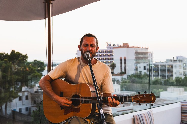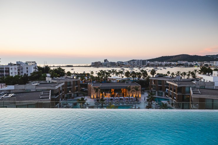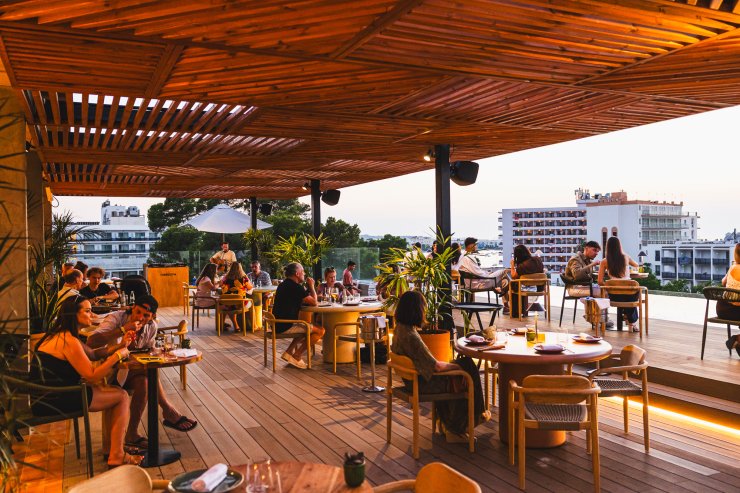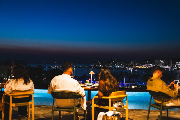 Before you, glimpses of the sunset emerge on the magnificent San Antonio skyline as the orange and purple tones fade to dark and the twinkling lights of Ibiza’s second-largest town come to life. If you look closely enough, you can catch peeks of the vibrant life below - a stark contrast to the relaxed rooftop setting.