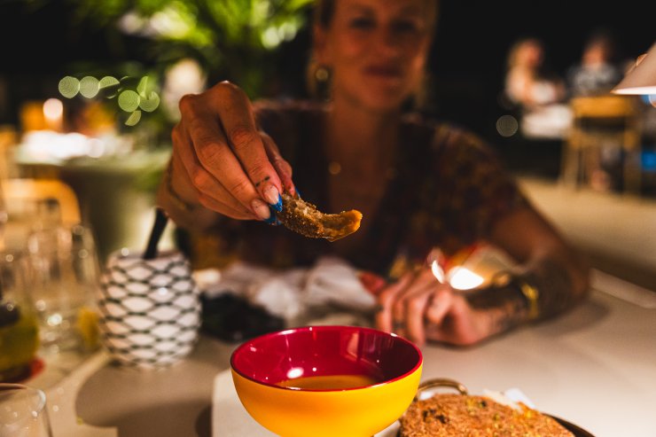 The breezy restaurant terrace offers romantic poolside seating for two or under shade-giving rooftop beams for larger groups. A small pool lines the balcony edge, a beautiful, romantic setting for couples and a cosy spot for friends to mark their evening.