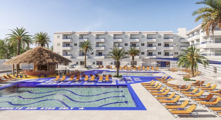 Rooms and studios are sleek and functional, each with a kitchen and terrace designed for pre-party glow-ups before hitting the nightlife. Outside, palm-lined pools and daybeds beckon sunworshippers, as DJs lay down the soundtrack for your stay. Food and drink options are diverse. When evening arrives, the on-site nightclub takes over, offering an intimate dancefloor just steps from your room.