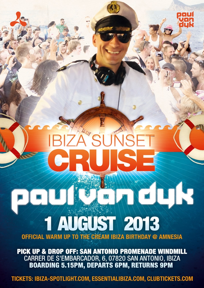 The pick up point for this voyage is the San Antonio Promenade Windmill, 6 Carrer De S'embarcador, San Antonio. You need to be ready to board at 5:15 for a 6pm departure. Paul Van Dyk promises to get you back to land at 9pm, just enough time to recharge for Cream at Amnesia.