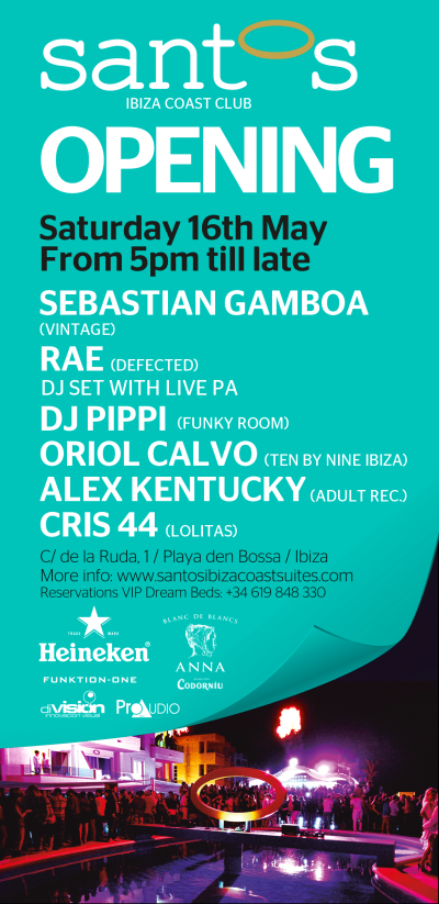All are welcome to come and check out the Santos opening and party with the sparkling pool on one side, the lapping waves on the other and the Ibiza night sky above.
