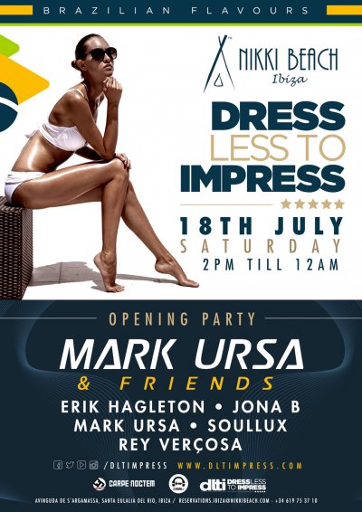 Citrus fruits are being prepared for a sexy squeezing this weekend as Nikki Beach is taken over by South America with its Brazilian themed Dress Less to Impress opening party. A vibrant outpouring of greens and yellows will be colouring the house and techouse party at the Santa Eulalia beach front venue as the DLTI party makes it Balearic debut on Saturday – and entry is free.