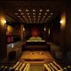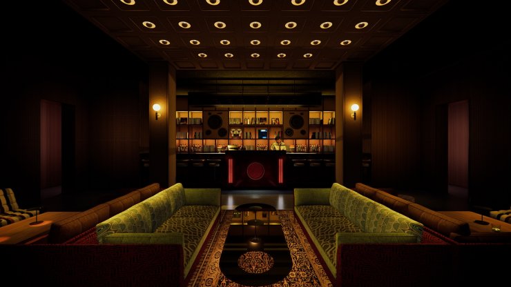 The dimly lit, retro-inspired lounge features soft hues, warm wood panelling, comfortable, low seating and discreet amber lighting, creating a stylish atmosphere.